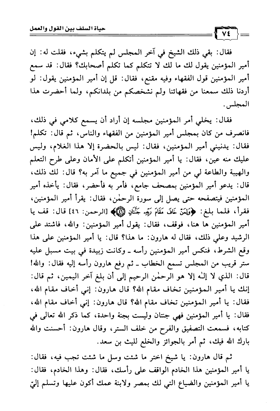فقال: يخلي أمر المؤمنين مجلسه إن أراد أن يسمع كلامي في ذلك، فانصرف من كان بمجلس أمير المؤمنين من الفقهاء والناس، ثم قال: تكلم! فقال: يدنيني أمير المؤمنين فقال: ليس بالحضرة إلا هذا الغلام، وليس عليك منه عين، فقال: يا أمير المؤمنين أتكلم على الأمان وعلى طرح التعلم والهيبة والطاعة لي من أمير المؤمنين في جميع ما آمر به؟ قال: لك ذلك، قال: يدعو أمير المؤمنين بمصحف جامع، فأمر به فأحضر، فقال: يأخذه أمير المؤمنين فيتصفحه حتى يصل إلى سورة الرحمن، فقال: يقرأ أمير المؤمنين، فقرأ فلما بلغ: {وَلِمَنْ خَافَ مَقَامَ رَبِّهِ جَنَّتَانِ} [الرحمن: 46] قال: قف يا أمير المؤمنين ها هنا، فوقف فقال: يقول أمير المؤمنين: والله، فاشتد على الرشيد وعلي ذلك، فقال له هارون: ما هذا؟ قال: يا أمير المؤمنين على هذا وقع الشرط، فنكس أمير المؤمنين رأسه - وكانت زبيدة في بيت مسبل عليه ستر قريب من المجلس تسمع الخطاب - ثم رفع هارون رأسه إليه فقال: والله! قال: الذي لا إله إلا هو الرحمن الرحيم إلى أن بلغ آخر اليمين، ثم قال: إنك يا أمير المؤمنين تخاف مقام الله؟ قال هارون: إني أخاف مقام الله، فقال: يا أمير المؤمنين تخاف مقام الله؟ قال هارون: إني أخاف مقام الله، فقال: يا أمير المؤمنين فهي جنتان وليست بجنة واحدة، كما ذكر الله تعالى في كتابه، فسمعت التصفيق والفرح من خلف الستر، وقال هارون: أحسنت والله بارك الله فيك، ثم أمر بالجوائز والخلع لليث بن سعد.