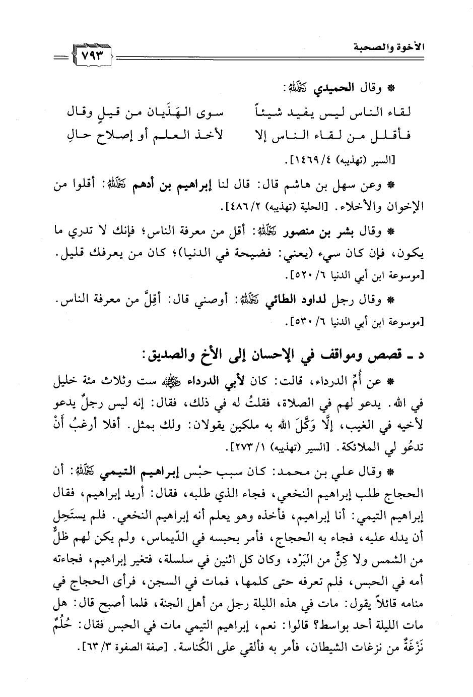 * وعن سهل بن هاشم قال: قال لنا إبراهيم بن أدهم رحمه الله: أقلوا من الإخوان والأخلاء. [الحلية (تهذيبه) 2/ 486].