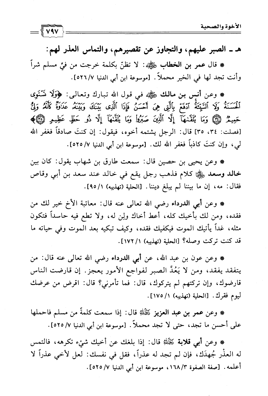 * وعن أنس بن مالك - رضي الله عنه - في قول الله تبارك وتعالى: {وَلاَ تَسْتَوِي الحَسَنَةُ وَلاَ السَّيِّئَةُ ادْفَعْ بِالَّتِي هِيَ أَحْسَنُ فَإِذَا الَّذِي بَيْنَكَ وَبَيْنَهُ عَدَاوَةٌ كَأَنَّهُ وَلِيٌّ حَمِيمٌ * وَمَا يُلَقَّاهَا إِلاَّ الَّذِينَ صَبَرُوا وَمَا يُلَقَّاهَا إِلاَّ ذُو حَظٍّ عَظِيمٍ} [فصلت: 34، 35] قال: الرجل يشتمه أخوه، فيقول: إن كنتَ صادقا فغفر الله لي، وإن كنتَ كاذبا فغفر الله لك. [موسوعة ابن أبي الدنيا 7/ 525].