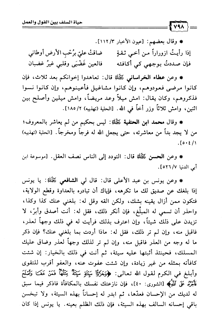 * وعن يونس بن عبد الأعلى قال: قال لي الشافعي رحمه الله: يا يونس إذا بلغك عن صديق لك ما تكرهه، فإياك أن تبادره بالعداوة وقطع الولاية، فتكون ممن أزال يقينه بشك، ولكن القه وقل له: بلغني عنك كذا وكذا، واحذر أن تسمي له المبلغ، فإن أنكر ذلك، فقل له: أنت أصدق وأبر لا تزيدن على ذلك شيئًا، وإن اعترف بذلك فرأيت له في ذلك وجهًا لعذر، فاقبل منه، وإن لم تر ذلك، فقل له: ماذا أردت بما بلغني عنك؟ فإن ذكر ما له وجه من العذر فاقبل منه، وإن لم تر لذلك وجهًا لعذر وضاق عليك المسلك، فحينئذ أثبتها عليه سيئة، ثم أنت في ذلك بالخيار: إن شئت كافأته بمثله من غير زيادة، وإن شئت عفوت عنه، والعفو أقرب للتقوى وأبلغ في الكرم لقول الله تعالى: {وَجَزَاء سَيِّئَةٍ سَيِّئَةٌ مِّثْلُهَا فَمَنْ عَفَا وَأَصْلَحَ فَأَجْرُهُ عَلَى اللَّهِ} [الشورى: 40] فإن نازعتك نفسك بالمكافأة فاذكر فيما سبق له لديك من الإحسان فعدّها، ثم ابدر له إحسانًا بهذه السيئة، ولا تبخسن باقي إحسانه السالف بهذه السيئة، فإن ذلك الظلم بعينه. يا يونس إذا كان