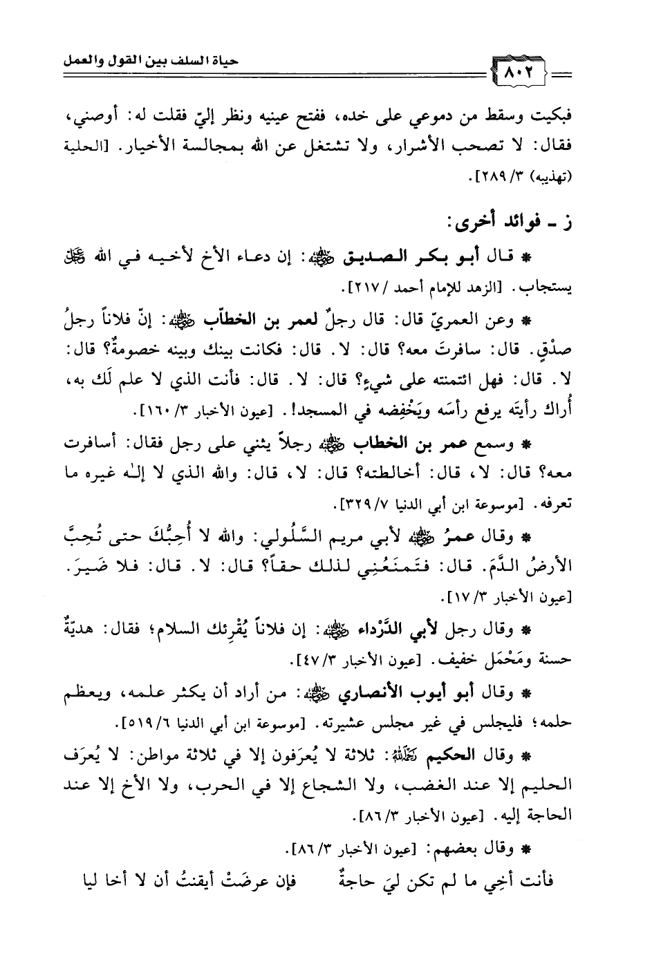* وعن العمريّ قال: قال رجلٌ لعمر بن الخطاّب رضى الله عنه: إنّ فلانًا رجلُ صدْقٍ. قال: سافرتَ معه؟ قال: لا. قال: فكانت بينك وبينه خصومةٌ؟ قال: لا. قال: فهل ائتمنته على شيءٍ؟ قال: لا. قال: فأنت الذي لا علم لَك به، أُراك رأيتَه يرفع رأسَه ويَخْفِضه في المسجد!. [عيون الأخبار 3/ 160].