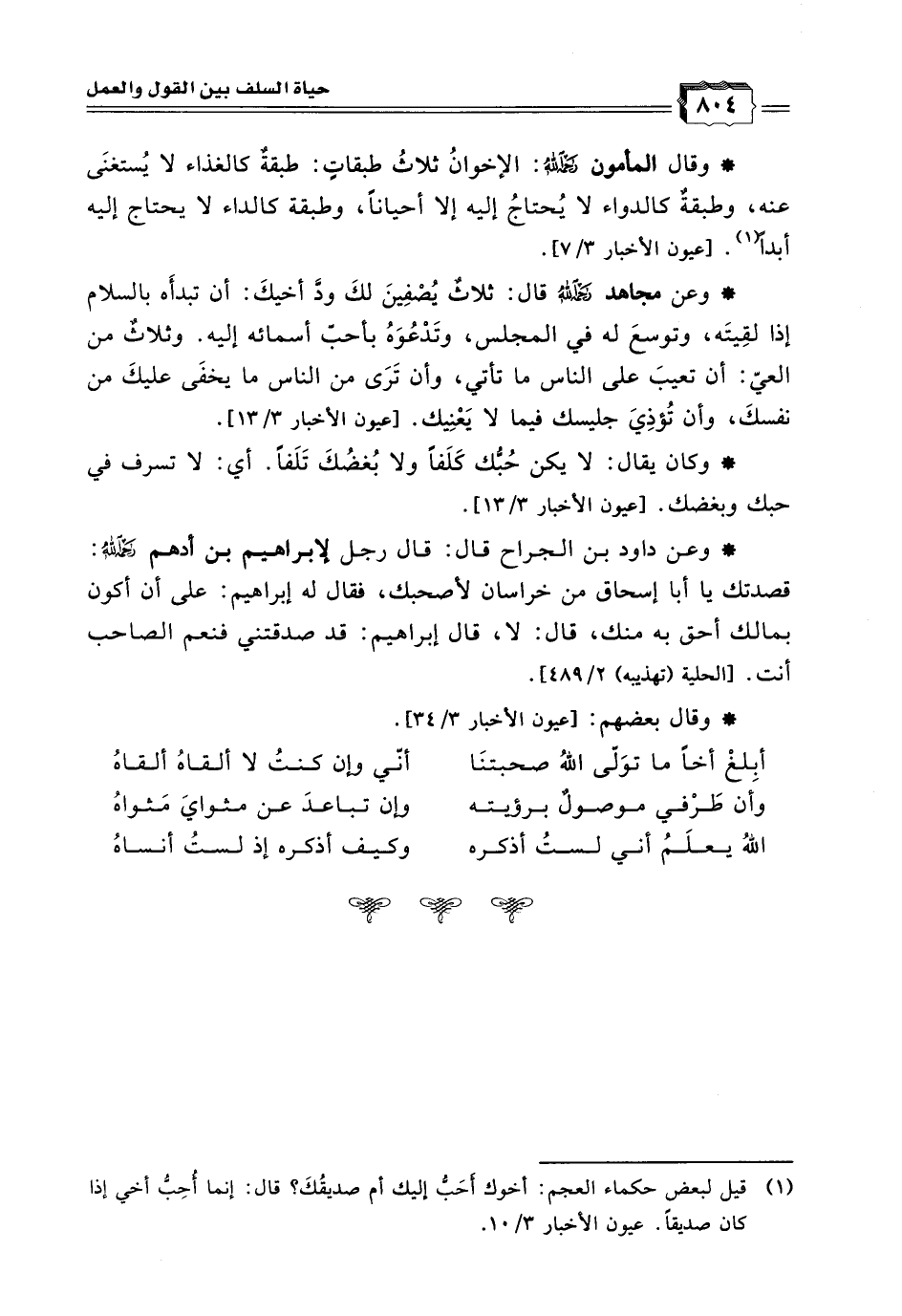 * وعن مجاهد رحمه الله قال: ثلاثٌ يُصْفِينَ لكَ ودَّ أخيكَ: أن تبدأَه بالسلام إذا لقِيتَه، وتوسعَ له في المجلس، وتَدْعُوَهُ بأحبّ أسمائه إليه. وثلاثٌ من العيّ: أن تعيبَ على الناس ما تأتي، وأن تَرَى من الناس ما يخفَى عليكَ من نفسكَ، وأن تُؤذِيَ جليسك فيما لا يَعْنِيك. [عيون الأخبار 3/ 13].