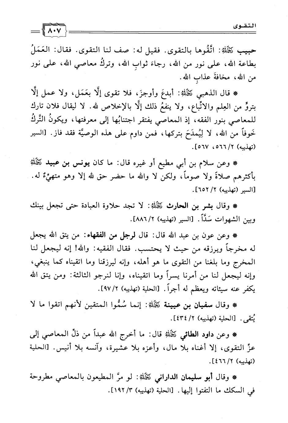 حبيب رحمه الله: اتَّقُوها بالتقوى. فقيل له: صف لنا التقوى. فقال: العَمَلُ بطاعة الله، على نور من الله، رجاءَ ثوابِ الله، وتركُ معاصي الله، على نور من الله، مخافةَ عذابِ الله.