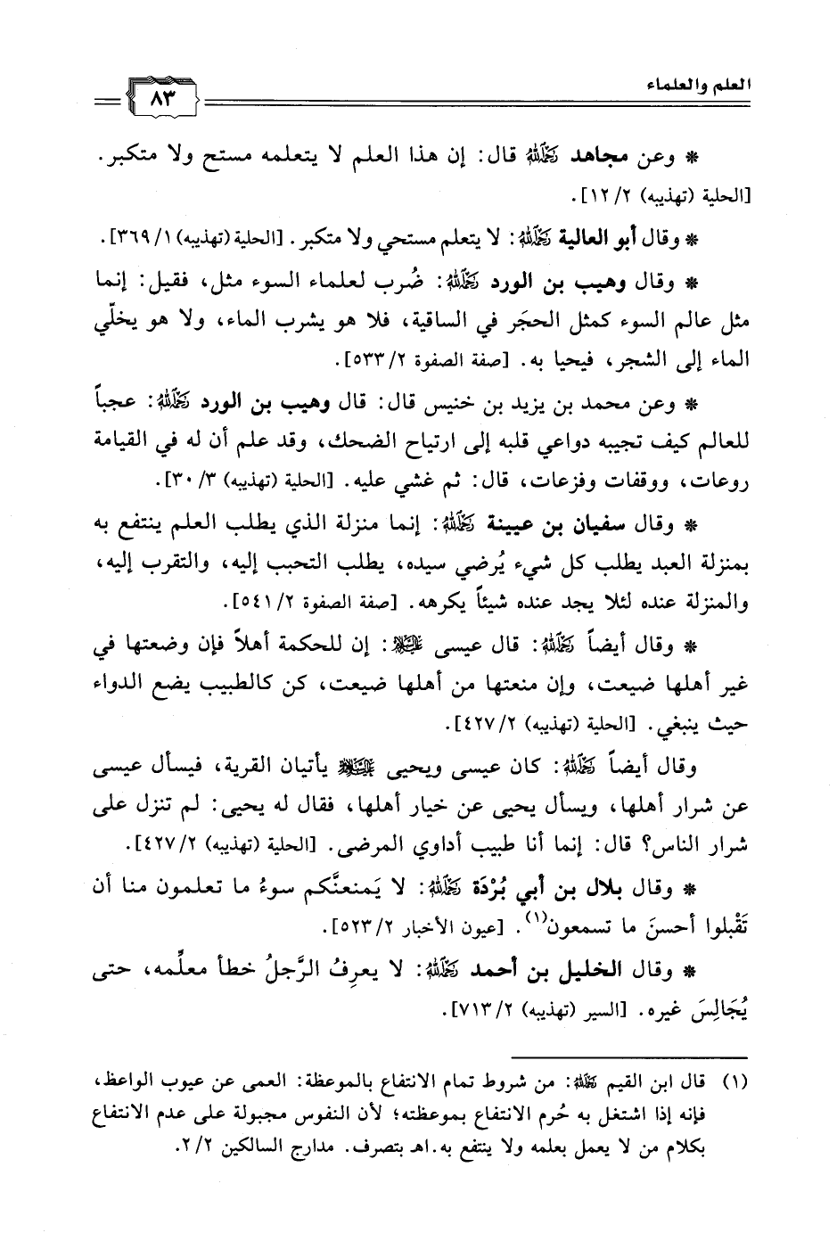 * وقال سفيان بن عيينة رحمه الله: إنما منزلة الذي يطلب العلم ينتفع به بمنزلة العبد يطلب كل شيء يُرضي سيده، يطلب التحبب إليه، والتقرب إليه، والمنزلة عنده لئلا يجد عنده شيئًا يكرهه. [صفة الصفوة 2/ 541].