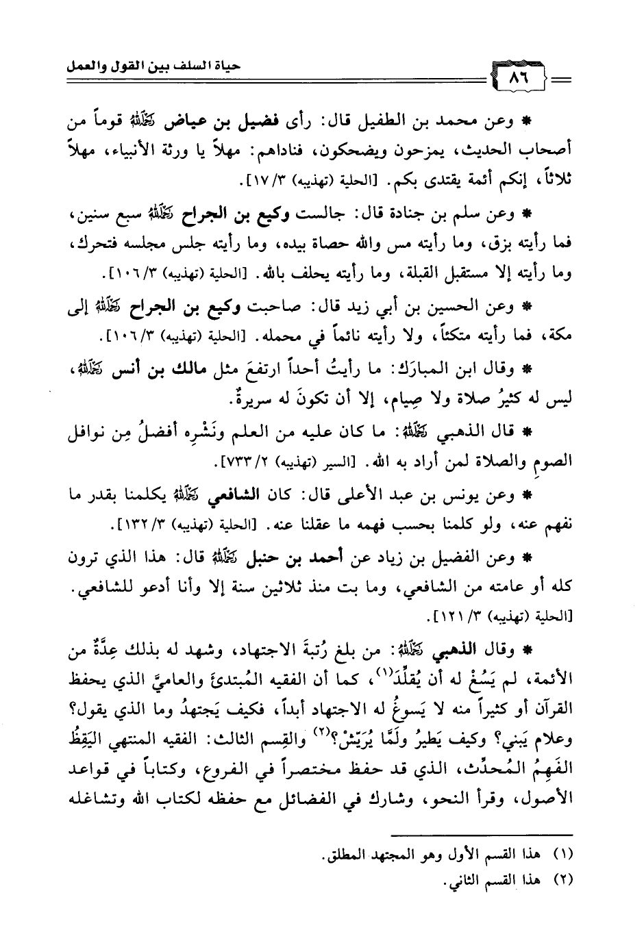 * قال الذهبي رحمه الله: ما كان عليه من العلم ونَشْرِه أفضلُ مِن نوافل الصومِ والصلاة لمن أراد به الله. [السير (تهذيبه) 2/ 733].
