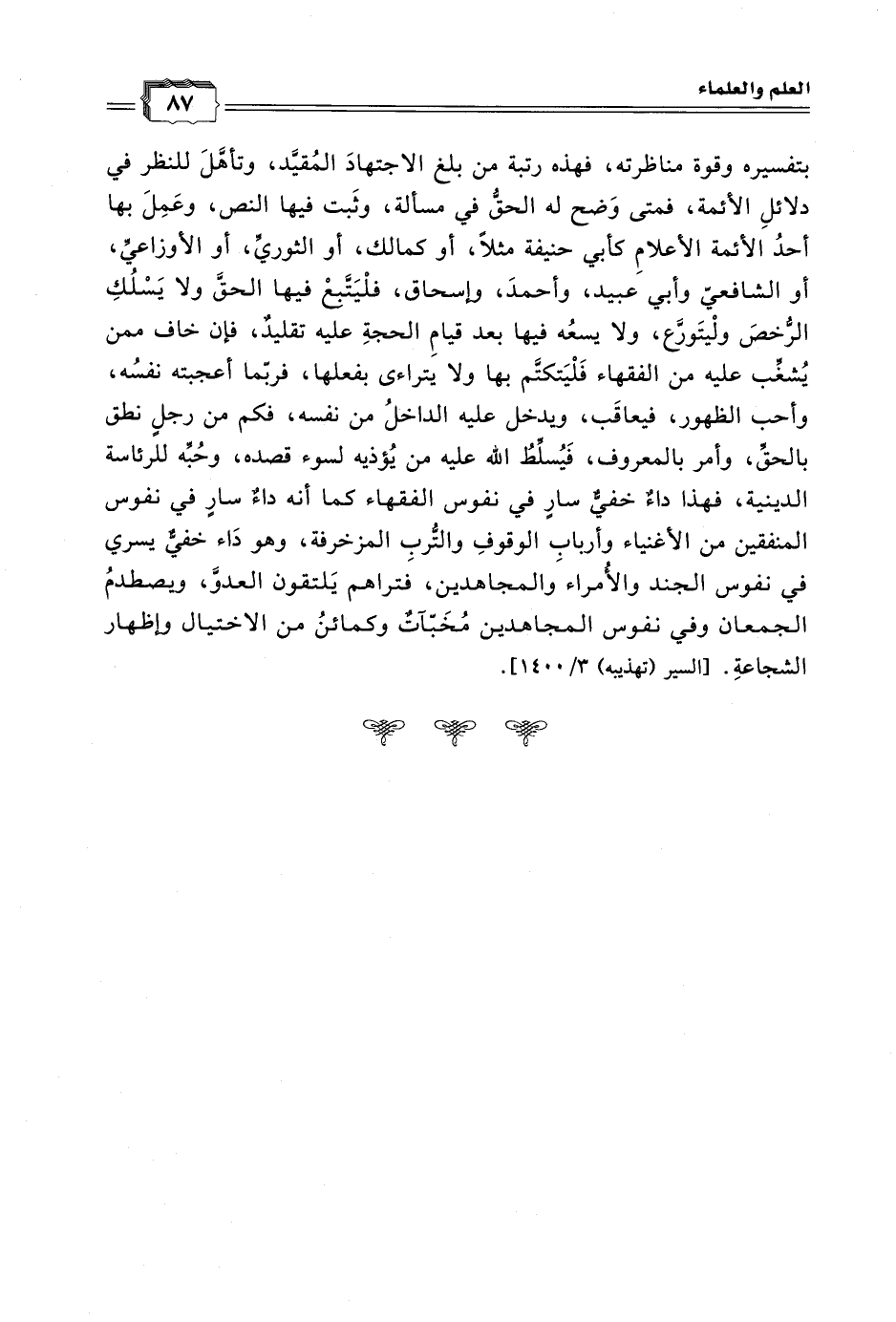 بتفسيره وقوة مناظرته، فهذه رتبة من بلغ الاجتهادَ المُقيَّد، وتأهَّلَ للنظر في دلائلِ الأئمة، فمتى وَضح له الحقُّ في مسألة، وثَبت فيها النص، وعَمِلَ بها أحدُ الأئمة الأعلامِ كأبي حنيفة مثلاً، أو كمالك، أو الثوريِّ، أو الأوزاعيِّ، أو الشافعيّ وأبي عبيد، وأحمدَ، وإسحاق، فلْيَتَّبِعْ فيها الحقَّ ولا يَسْلُكِ الرُّخصَ ولْيتَورَّع، ولا يسعُه فيها بعد قيامِ الحجةِ عليه تقليدٌ، فإن خاف ممن يُشغِّب عليه من الفقهاء فَلْيَتكتَّم بها ولا يتراءى بفعلها، فربّما أعجبته نفسُه، وأحب الظهور، فيعاقَب، ويدخل عليه الداخلُ من نفسه، فكم من رجلٍ نطق بالحقِّ، وأمر بالمعروف، فَيُسلِّطُ الله عليه من يُؤذيه لسوء قصده، وحُبِّه للرئاسة الدينية، فهذا داءٌ خفيٌّ سارٍ في نفوس الفقهاء كما أنه داءٌ سارٍ في نفوس المنفقين من الأغنياء وأربابِ الوقوفِ والتُّربِ المزخرفة وهو دَاء خفيٌّ يسري في نفوس الجند والأُمراء والمجاهدين، فتراهم يَلتقون العدوَّ، ويصطدمُ الجمعان وفي نفوس المجاهدين مُخَبّآتٌ وكمائنُ من الاختيال وإظهار الشجاعةِ. [السير (تهذيبه) 3/ 1400].