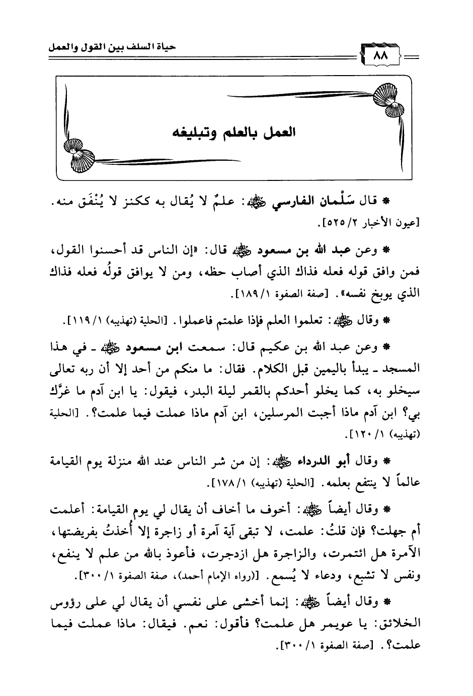 * وقال أبو الدرداء - رضي الله عنه -: إن من شر الناس عند الله منزلة يوم القيامة عالمًا لا ينتفع بعلمه. [الحلية (تهذيبه) 1/ 178].