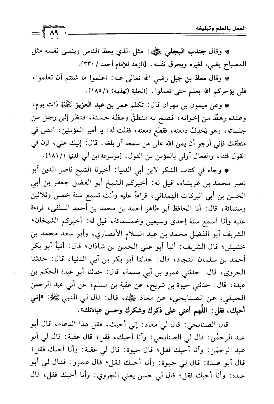 * وقال معاذ بن جبل رضي الله تعالى عنه: اعلموا ما شئتم أن تعلموا، فلن يؤجركم الله بعلم حتى تعملوا. [الحلية (تهذيبه) 1/ 185].