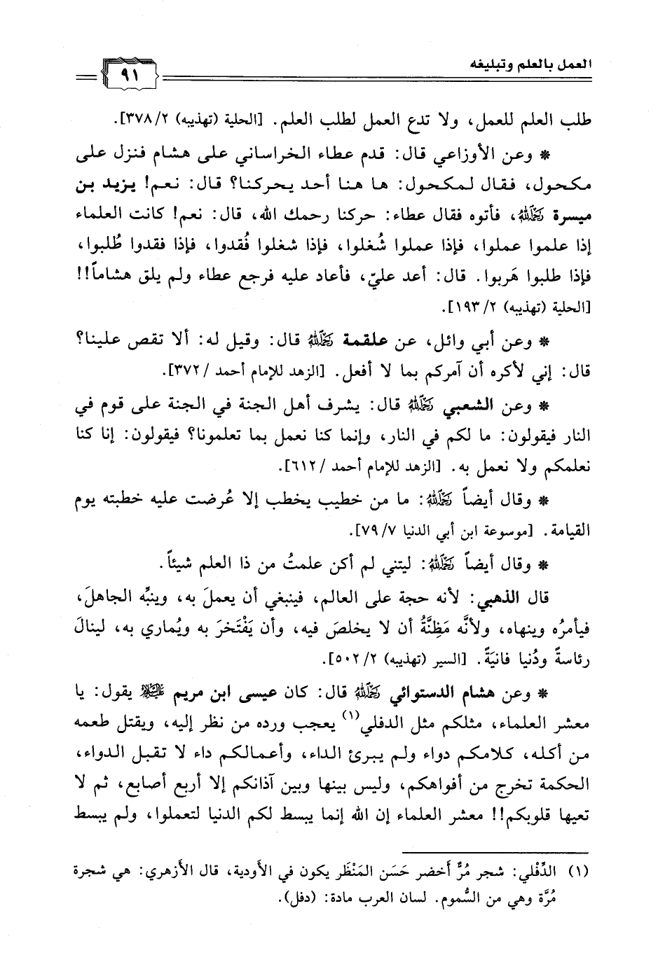 * وعن هشام الدستوائي رحمه الله قال: كان عيسى ابن مريم - عليه السلام - يقول: يا معشر العلماء، مثلكم مثل الدفلي (¬1) يعجب ورده من نظر إليه، ويقتل طعمه من أكله، كلامكم دواء ولم يبرئ الداء، وأعمالكم داء لا تقبل الدواء، الحكمة تخرج من أفواهكم، وليس بينها وبين آذانكم إلا أربع أصابع، ثم لا تعيها قلوبكم!! معشر العلماء إن الله إنما يبسط لكم الدنيا لتعملوا، ولم يبسط
