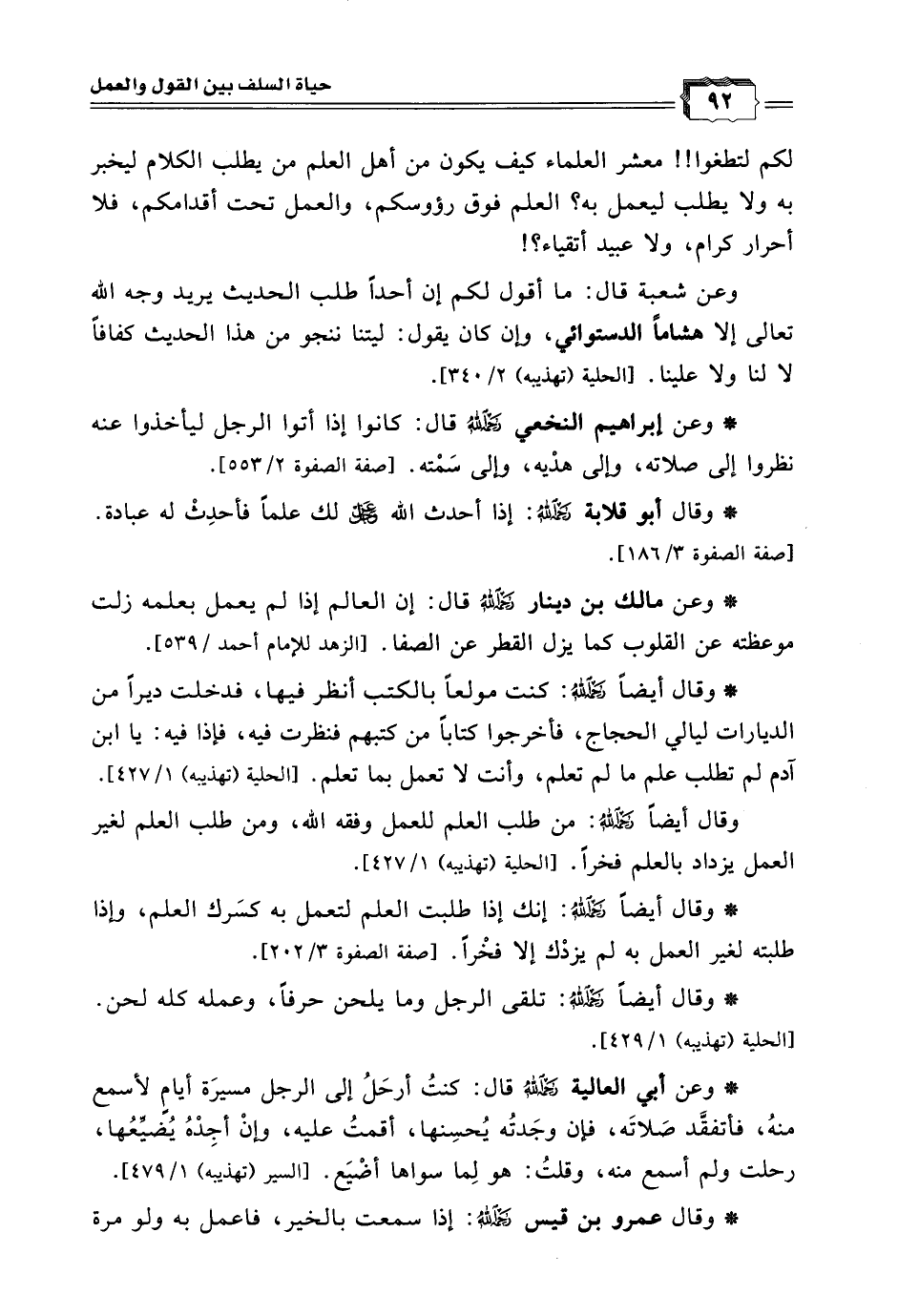 لكم لتطغوا!! معشر العلماء كيف يكون من أهل العلم من يطلب الكلام ليخبر به ولا يطلب ليعمل به؟ العلم فوق رؤوسكم، والعمل تحت أقدامكم، فلا أحرار كرام، ولا عبيد أتقياء؟! [الحلية (تهذيبه) 2/ 340].