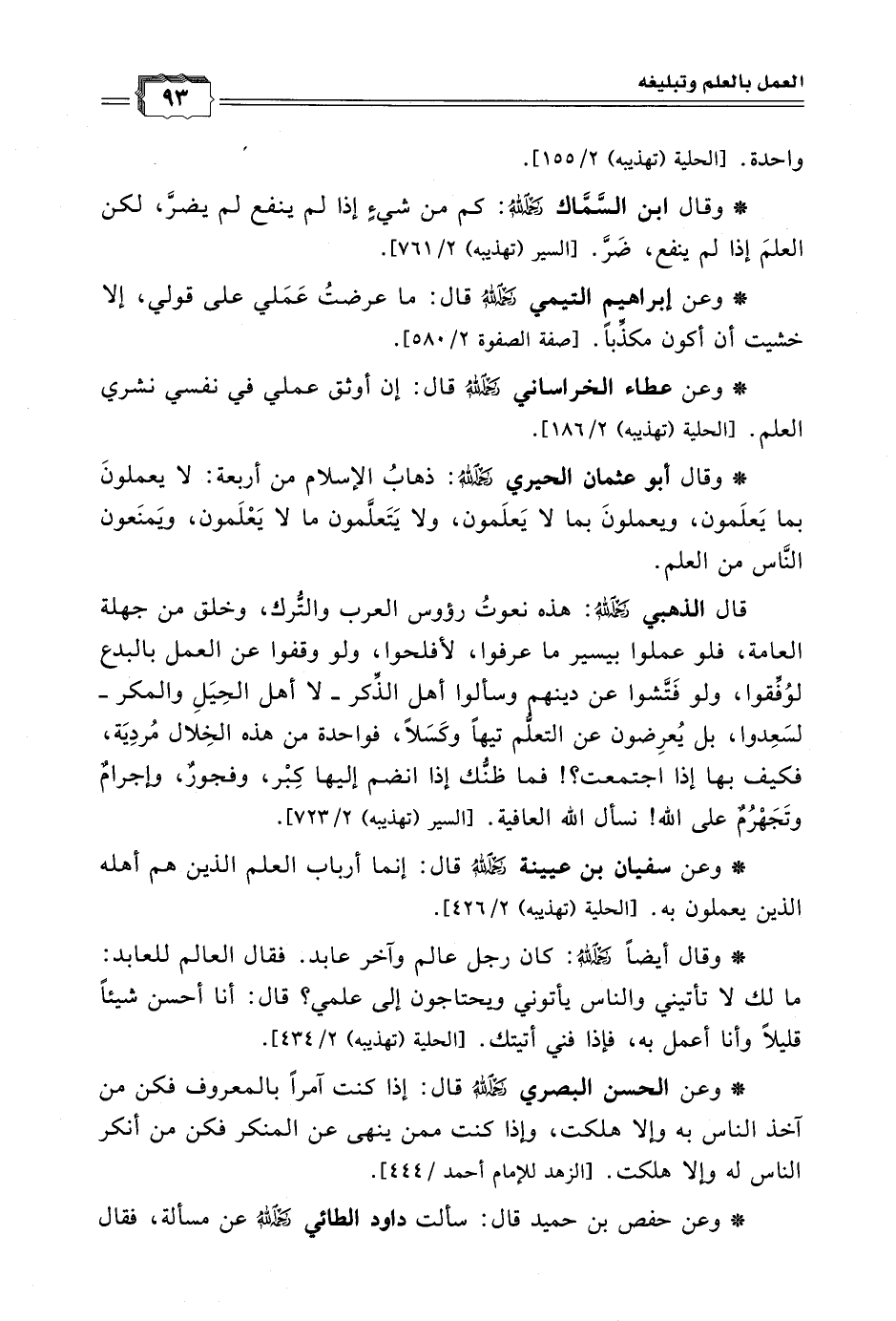 * وقال ابن السَّمَّاك رحمه الله: كم من شيءٍ إذا لم ينفع لم يضرَّ، لكن العلمَ إذا لم ينفع، ضَرَّ. [السير (تهذيبه) 2/ 761].