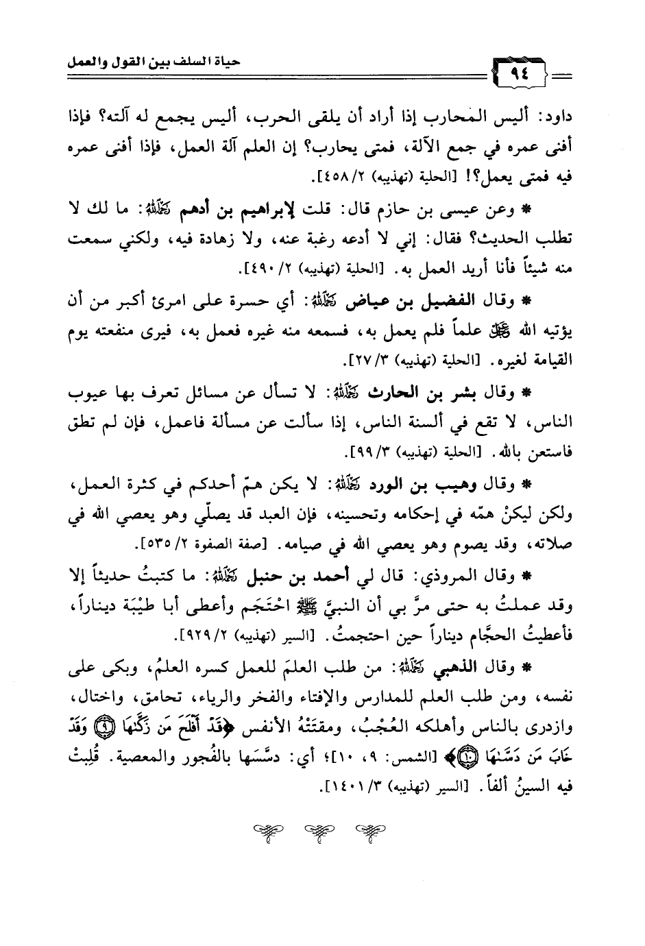 * وعن عيسى بن حازم قال: قلت لإبراهيم بن أدهم رحمه الله: مالك لا تطلب الحديث؟ فقال: إني لا أدعه رغبة عنه، ولا زهادة فيه، ولكني سمعت منه شيئًا فأنا أريد العمل به. [الحلية (تهذيبه) 2/ 490].