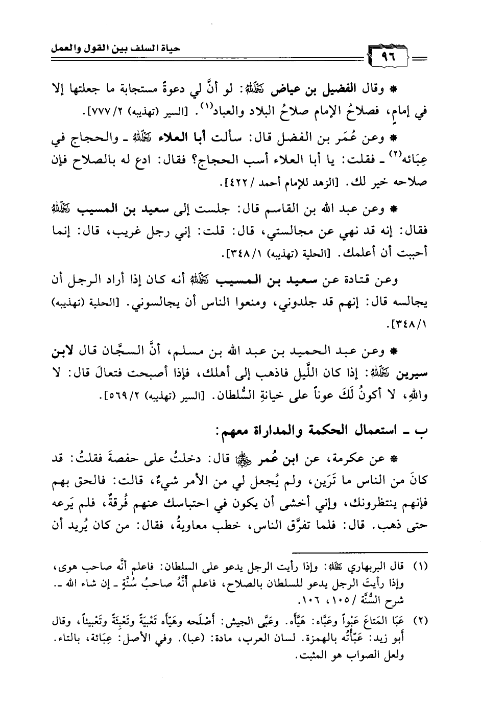 * وقال الفضيل بن عياض رحمه الله: لو أنَّ لي دعوةً مستجابة ما جعلتها إلا في إمامٍ، فصلاحُ الإمام صلاحُ البلاد والعباد. (¬1) [السير (تهذيبه) 2/ 777].
