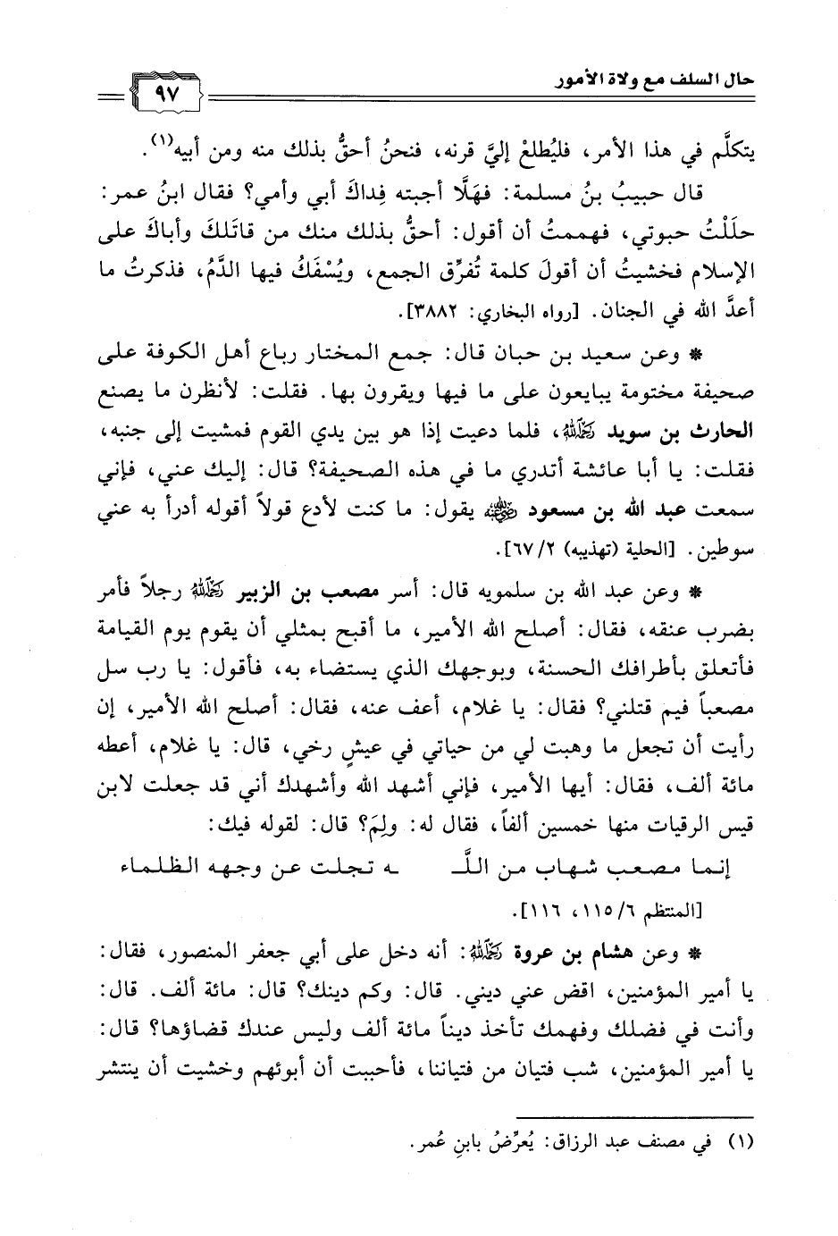 قال حبيبُ بنُ مسلمة: فهَلاَّ أجبته فِداكَ أبي وأمي؟ فقال ابنُ عمر: حلَلْتُ حبوتي، فهممتُ أن أقول: أحقُّ بذلك منك من قاتَلكَ وأباكَ على الإسلام فخشيتُ أن أقولَ كلمة تُفرِّق الجمع، ويُسْفَكُ فيها الدَّمُ، فذكرتُ ما أعدَّ الله في الجنان. [رواه البخاري: 3882].