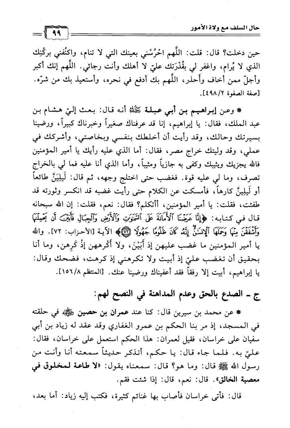 * وعن إبراهيم بن أبي عبلة رحمه الله أنه قال: بعث إليّ هشام بن عبد الملك، فقال: يا إبراهيم، إنا قد عرفناك صغيرًا وخبرناك كبيرًا، ورضينا بسيرتك وحالك، وقد رأيت أن أخلطك بنفسي وبخاصتي، وأشركك في عملي، وقد وليتك خراج مصر، فقال: أما الذي عليه رأيك يا أمير المؤمنين فالله يجزيك ويثيبك وكفى به جازيًا ومثيبًا، وأما الذي أنا عليه فمالي بالخراج تصرف، ومالي عليه قوة. فغضب حتى اختلج وجهه، ثم قال: لَيلِيَنَّ طائعًا أو لَيلِينَّ كارهًا، فأمسكت عن الكلام حتى رأيت غضبه قد انكسر وثورته قد طفئت، فقلت: يا أمير المؤمنين، أأتكلم؟ فقال: نعم، فقلت: إن الله سبحانه قال في كتابه: {إِنَّا عَرَضْنَا الْأَمَانَةَ عَلَى السَّمَاوَاتِ وَالْأَرْضِ وَالْجِبَالِ فَأَبَيْنَ أَن يَحْمِلْنَهَا وَأَشْفَقْنَ مِنْهَا وَحَمَلَهَا الْإِنسَانُ إِنَّهُ كَانَ ظَلُومًا جَهُولاً} الآية [الأحزاب: 72]. والله يا أمير المؤمنين ما غضب عليهن إذ أَبَيْنَ، ولا أَكْرههن إذْ كَرِهن، وما أنا بحقيق أن تغضب عليّ إذ أبيت ولا تكرهني إذ كرهت، فضحك وقال: يا إبراهيم، أبيت إلا رفقًا فقد أعفيناك ورضينا عنك. [المنتظم 8/ 156].