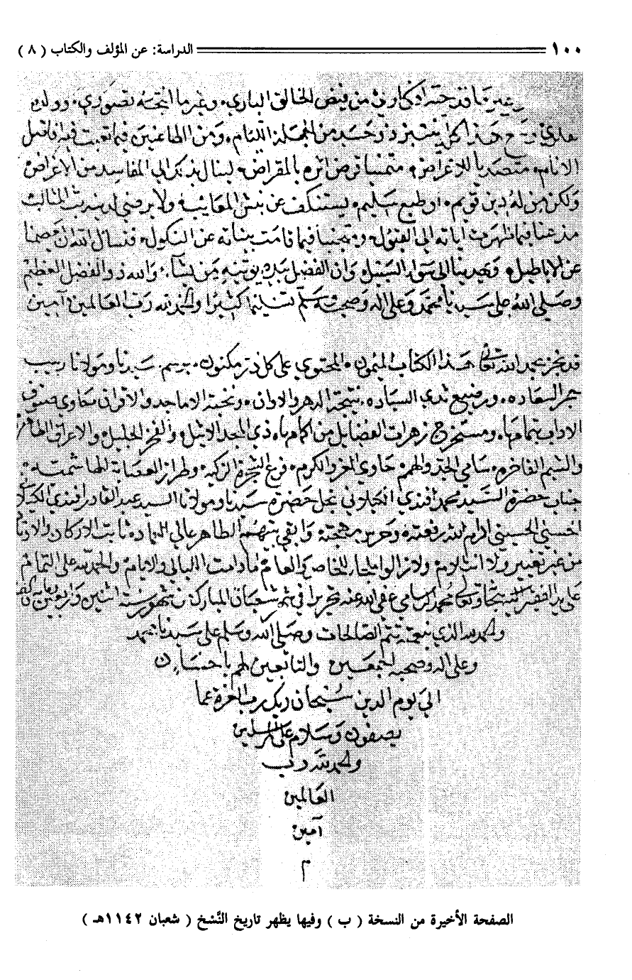 الصفحة الأخيرة من النسخة (ب) وفيها يظهر تاريخ النَّسخ (شعبان 1142 هـ)