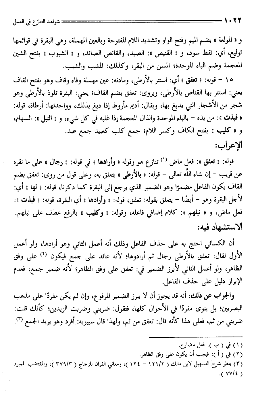 أن الكسائي احتج به على حذف الفاعل وذلك أنه أعمل الثاني وهو أرادها، ولو أعمل الأول لقال: تعفق بالأرطى رجال ثم أرادوها؛ لأنه عائد على جمع فيكون (¬2) على وفق الظاهر، ولو أعمل الثاني لأبرز الضمير في: تعفق على وفق الظاهر؛ لأنه ضمير جمع، فعدم الإبراز دليل على حذف الفاعل.