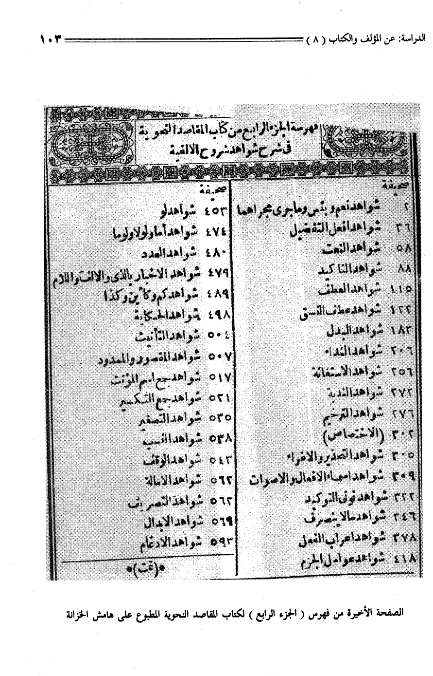 الصفحة الأخيرة من فهرس (الجزء الرابع) لكتاب المقاصد النحوية المطبوع على هامش الخزانة