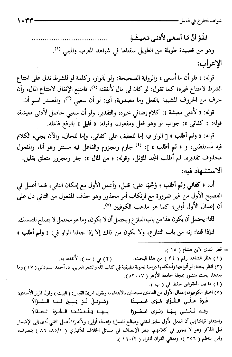 (¬5) اختار الكوفيون إعمال الأول من العاملين مستدلين بالابتداء به وبقول امرئ القيس: (البيت) وقول المرار الأسدي: