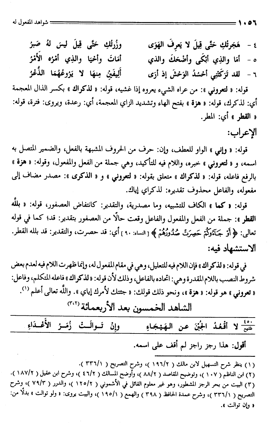 في قوله: "لذكراك" فإن اللام فيه للتعليل، وهي في مقام المفعول له، وإنما ظهرت اللام فيه لعدم بعض شروط النصب باللام المقدرة وهي: اتحاده بالفاعل، وذلك لأن قوله: "لذكراك" فاعله المتكلم، وفاعل: "تعروني" هو قوله: "هزة"، ونحو ذلك قولك: "جئتك لأمرك إياي". والله تعالى أعلم (¬1).