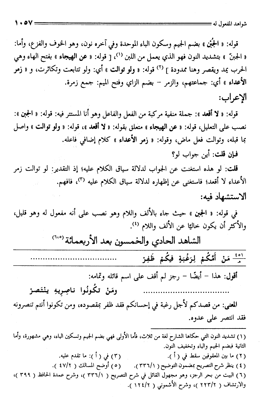 في قوله: "الجبن" حيث جاء بالألف واللام وهو نصب على أنه مفعول له وهو قليل، والأكثر أن يكون خاليًا عن الألف واللام (¬4).