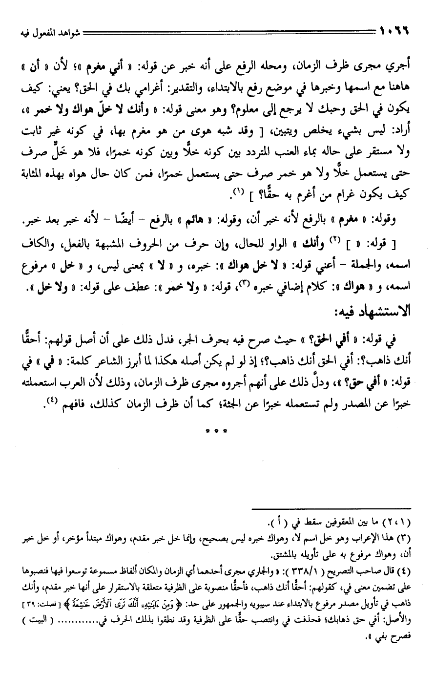 في قوله: "أفي الحق؟ " حيث صرح فيه بحرف الجر، فدل ذلك على أن أصل قولهم: أحقًّا أنك ذاهب؟: أفي الحق أنك ذاهب؟؛ إذ لو لم يكن أصله هكذا لما أبرز الشاعر كلمة: "في" في قوله: "أفي حق؟ "، ودلَّ ذلك على أنهم أجروه مجرى ظرف الزمان، وذلك لأن العرب استعملته خبرًا عن المصدر ولم تستعمله خبرًا عن الجثة؛ كما أن ظرف الزمان كذلك، فافهم (¬4).