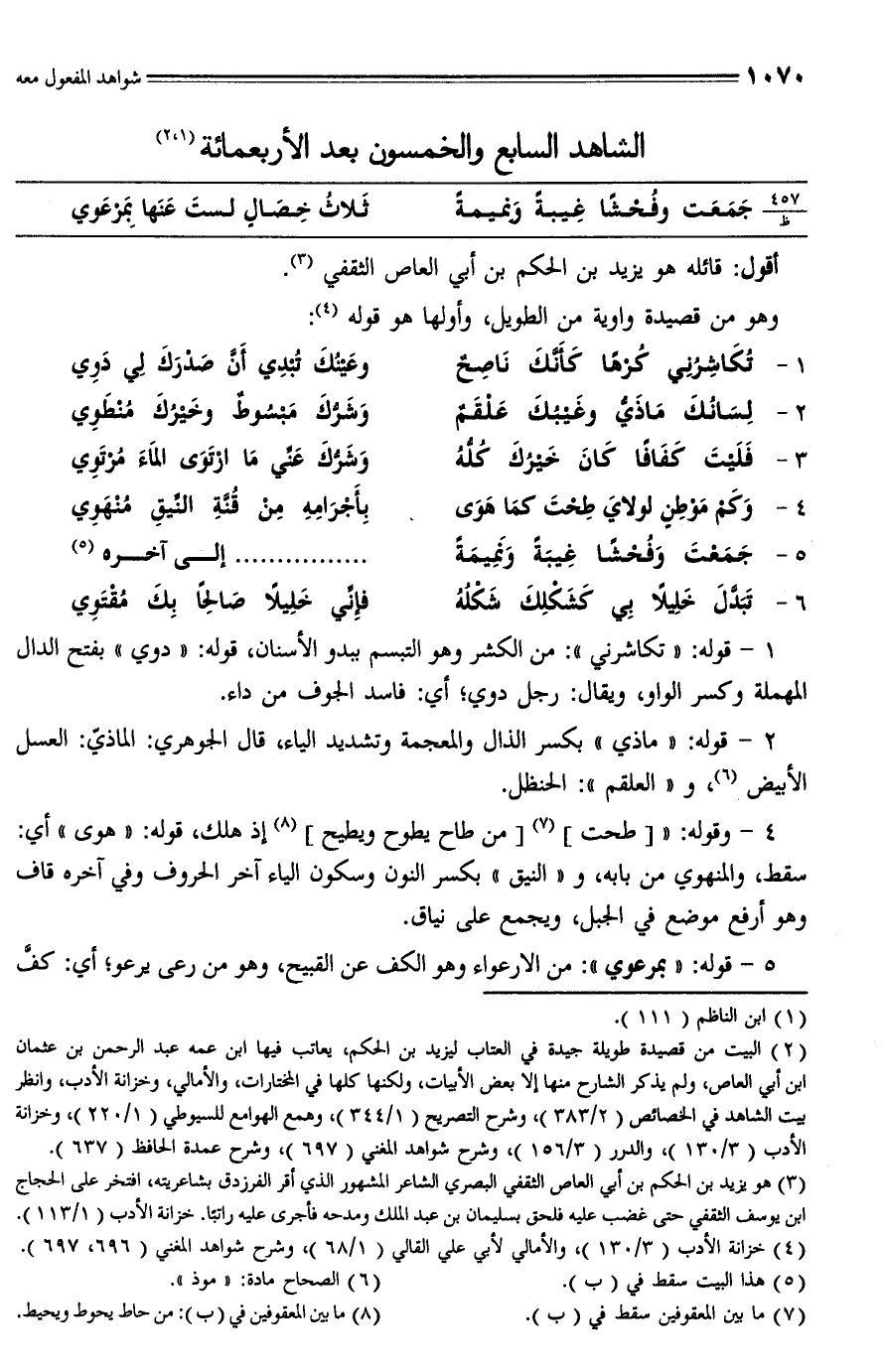 (¬2) البيت من قصيدة طويلة جيدة في العتاب ليزيد بن الحكم، يعاتب فيها ابن عمه عبد الرحمن بن عثمان بن أبي العاص، ولم يذكر الشارح منها إلا بعض الأبيات، ولكنها كلها في المختارات، والأمالي، وخزانة الأدب، وانظر بيت الشاهد في الخصائص (2/ 383)، وشرح التصريح (1/ 344)، وهمع الهوامع للسيوطي (1/ 220)، وخزانة الأدب (3/ 130)، والدرر (3/ 156)، وشرح شواهد المغني (697)، وشرح عمدة الحافظ (637).