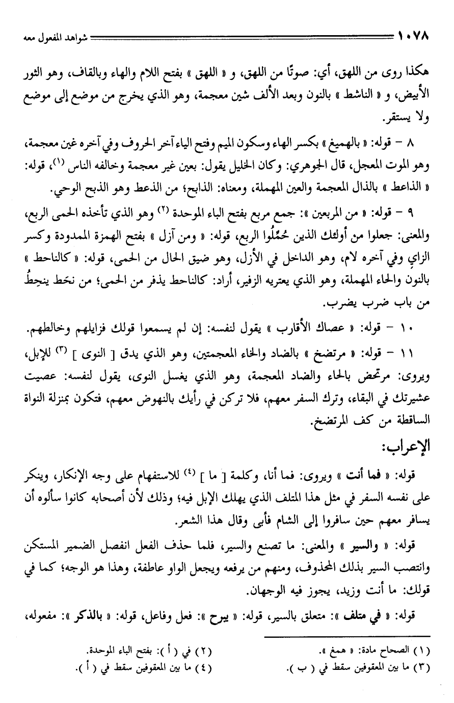 9 - قوله: "من المربعين": جمع مربع بفتح الباء الموحدة (¬2) وهو الذي تأخذه الحمى الربع، والمعنى: جعلوا من أولئك الذين حُمِّلُوا الربع, قوله: "ومن آزل" بفتح الهمزة الممدودة وكسر الزاي وفي آخره لام، وهو الداخل في الأزل، وهو ضيق الحال من الحمى, قوله: "كالناحط" بالنون والحاء المهملة، وهو الذي يعتريه الزفير، أراد: كالناحط يذفر من الحمى؛ من نحَط ينحِطُ من باب ضرب يضرب.