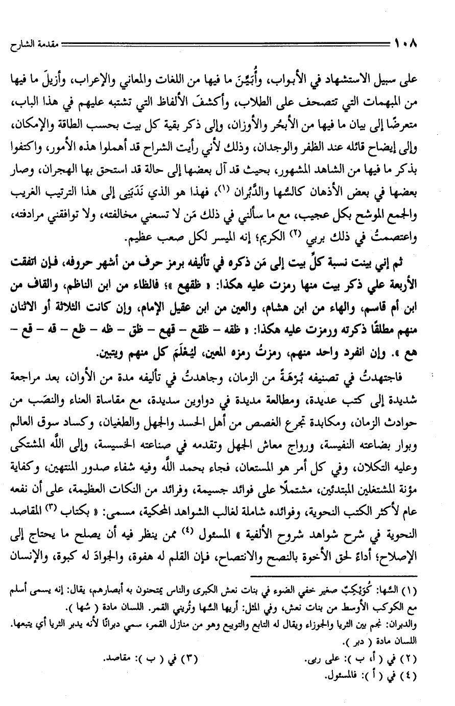 على سبيل الاستشهاد في الأبواب، وأُبَيِّنَ ما فيها من اللغات والمعاني والإعراب، وأزيلَ ما فيها من المبهمات التي تتصحف على الطلاب، وأكشفَ الألفاظ التي تشتبه عليهم في هذا الباب، متعرضًا إلى بيان ما فيها من الأبحُر والأوزان، وإلى ذكر بقية كل بيت بحسب الطاقة والإمكان، وإلى إيضاح قائله عند الظفر والوجدان، وذلك لأني رأيت الشراح قد أهملوا هذه الأمور، واكتفوا بذكر ما فيها من الشاهد المشهور، بحيث قد آل بعضها إلى حالة قد استحق بها الهجران، وصار بعضها في بعض الأذهان كالسُّها والدَّبُران (¬1)، فهذا هو الذي نَدَبَنِي إلى هذا الترتيب الغريب والجمع الموشح بكل عجيب، مع ما سألني في ذلك مَن لا تسعني مخالفته، ولا توافقني مرادفته، واعتصمتُ في ذلك بربي (¬2) الكريم؛ إنه الميسر لكل صعب عظيم.