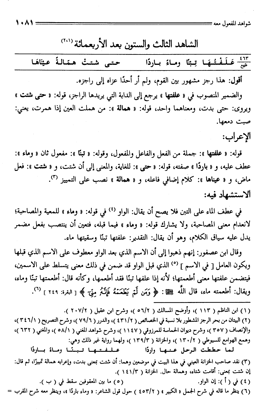 قوله: "علفتها": جملة من الفعل والفاعل والمفعول، وقوله: "تبنًا": مفعول ثان "وماء": عطف عليه، و "باردًا" صفته, قوله: "حتى": للغاية، والمعنى إلى أن شتت، و"شتت": فعل ماض، و"عيناها": كلام إضافي فاعله، و "همالة" نصب على التمييز (¬3).