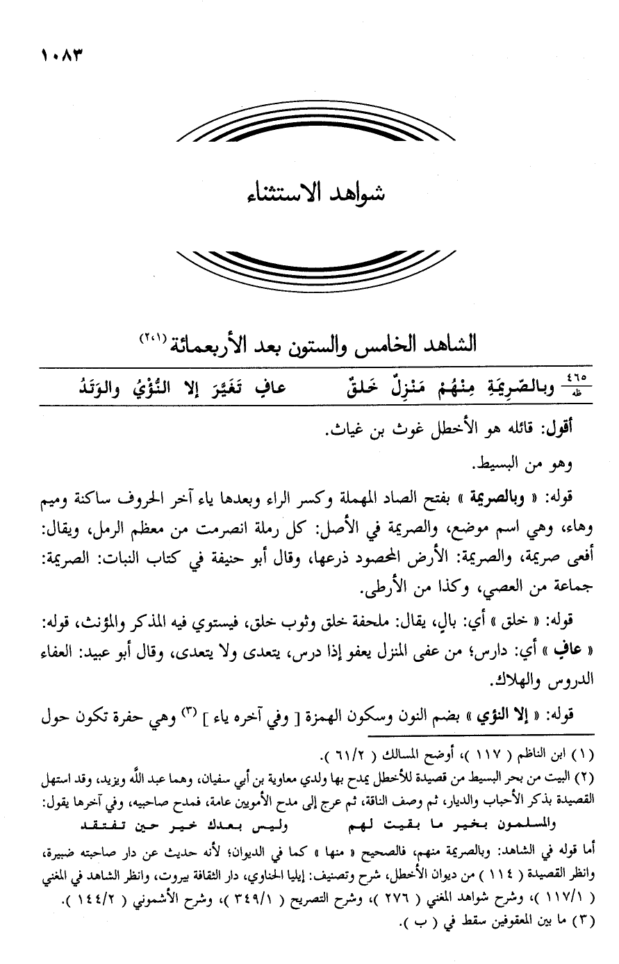 أما قوله في الشاهد: وبالصريمة منهم، فالصحيح "منها" كما في الديوان؛ لأنه حديث عن دار صاحبته ضبيرة، وانظر القصيدة (114) من ديوان الأخطل، شرح وتصنيف: إيليا الحناوي، دار الثقافة بيروت، وانظر الشاهد في المغني (1/ 117)، وشرح شواهد المغني (276)، وشرح التصريح (1/ 349)، وشرح الأشموني (2/ 144).