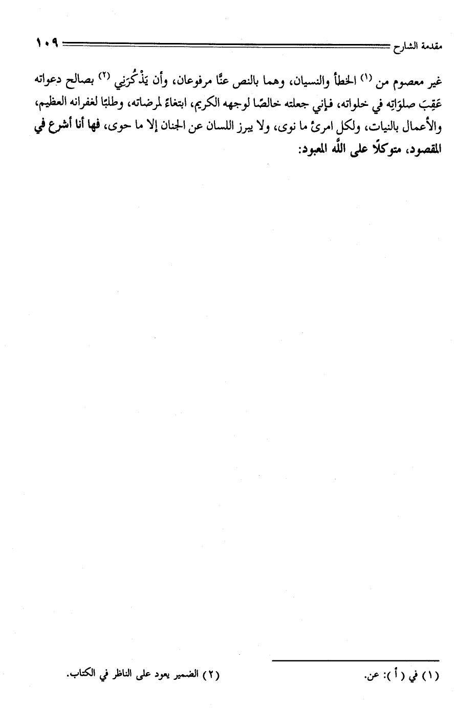غير معصوم من (¬1) الخطأ والنسيان، وهما بالنص عنَّا مرفوعان، وأن يَذْكُرَني (¬2) بصالح دعواته عَقِبَ صلوَاتِه في خلواته، فإني جعلته خالصًا لوجهه الكريم، ابتغاءً لمرضاته، وطلبًا لغفرانه العظيم، والأعمال بالنيات، ولكل امرئ ما نوى، ولا يبرز اللسان عن الجنان إلا ما حوى، فها أنا أشرع في المقصود، متوكلًا على الله المعبود: