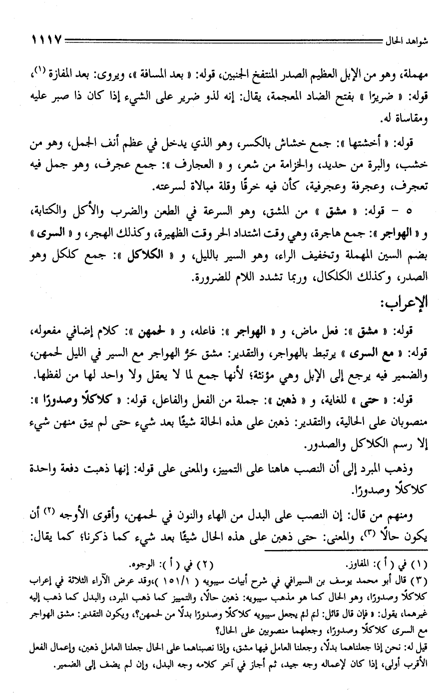 (¬3) قال أبو محمد يوسف بن السيرافي في شرح أبيات سيبويه (1/ 151)، وقد عرض الآراء الثلاثة في إعراب كلاكلًا وصدورًا، وهو الحال كما هو مذهب سيبويه: ذهبن حالًا، والتمييز كما ذهب المبرد، والبدل كما ذهب إليه غيرهما، يقول: "فإن قال قائل: لمَ لمْ يجعل سيبويه كلاكلًا وصدورًا بدلًا من لحمهن؟، ويكون التقدير: مشق الهواجر مع السرى كلاكلًا وصدورًا، وجعلهما منصوبين على الحال؟