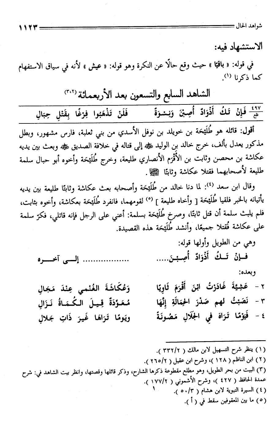 أقول: قائله هو طُلَيْحَة بن خويلد بن نوفل الأسدي من بني ثعلبة، فارس مشهور، وبطل مذكور يعدل بألف، خرج خالد بن الوليد - رضي الله عنه - إلى قتاله في خلافة الصديق - صلى الله عليه وسلم - وبعث بين يديه عكاشة بن محصن وثابت بن الأَقْرَم الأنصاري طليعة، وخرج طُلَيحَة وأخوه أبو حبال سلمة طليعة لأصحابهما فقتلا عكاشة وثابتًا - رضي الله عنهما -.