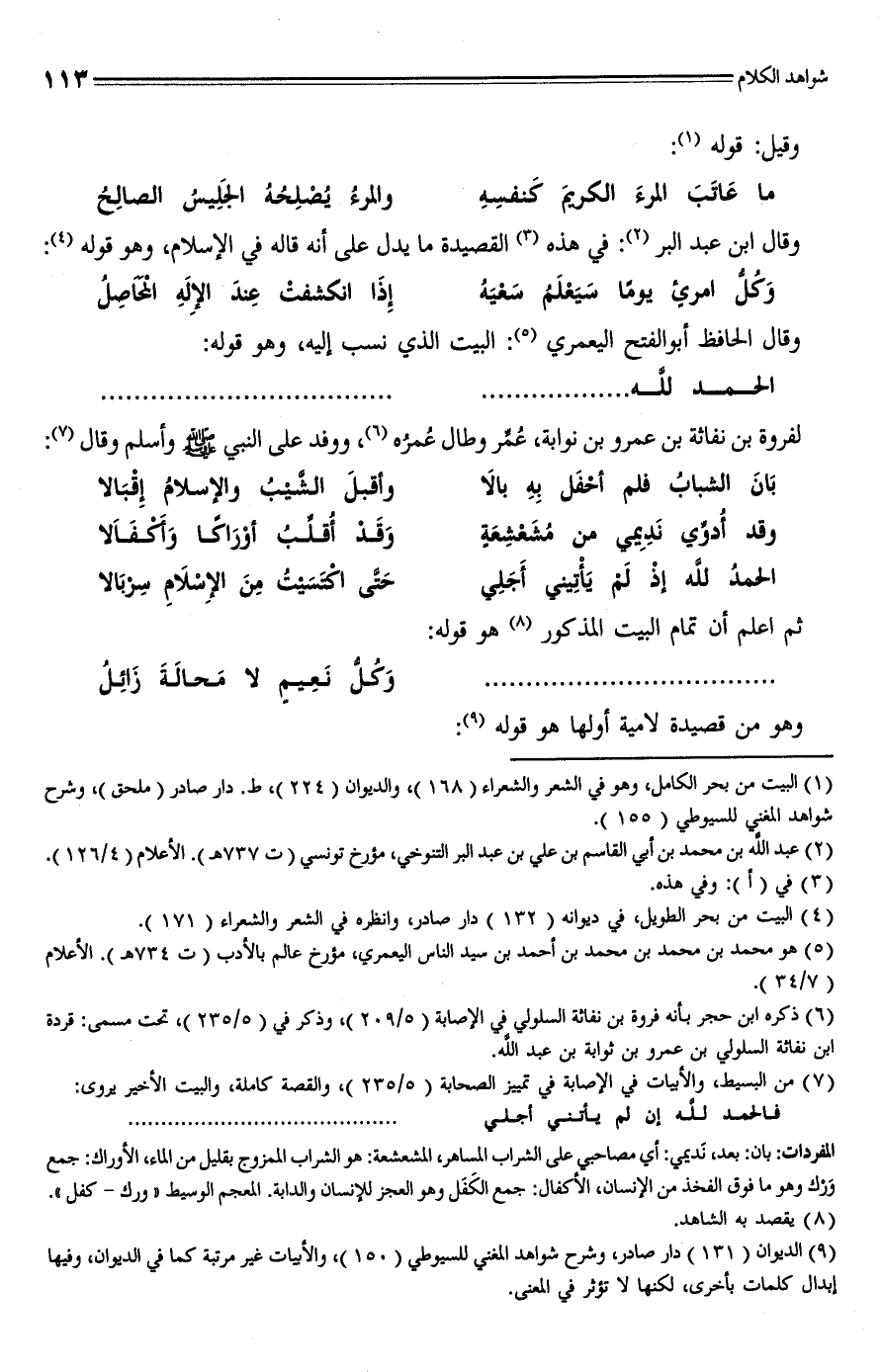 (¬9) الديوان (131) دار صادر، وشرح شواهد المغني للسيوطي (150)، والأبيات غير مرتبة كما في الديوان، وفيها إبدال كلمات بأخرى، لكنها لا تؤثر في المعنى.