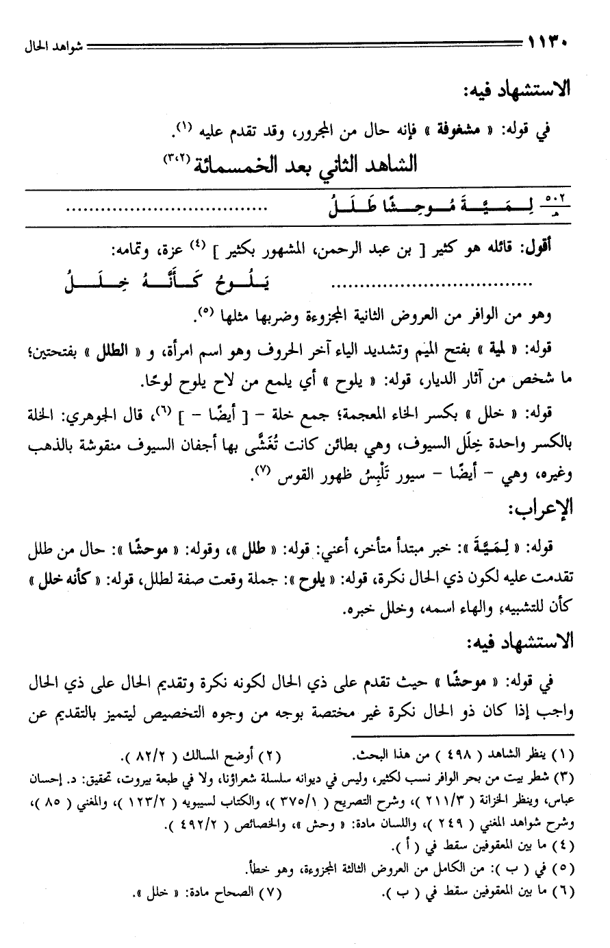 (¬3) شطر بيت من بحر الوافر نسب لكثير، وليس في ديوانه سلسلة شعراؤنا، ولا في طبعة بيروت، تحقيق: د. إحسان عباس، وينظر الخزانة (3/ 211)، وشرح التصريح (1/ 375)، والكتاب لسيبويه (2/ 123)، والمغني (85)، وشرح شواهد المغني (249)، واللسان مادة: "وحش"، والخصائص (2/ 492).