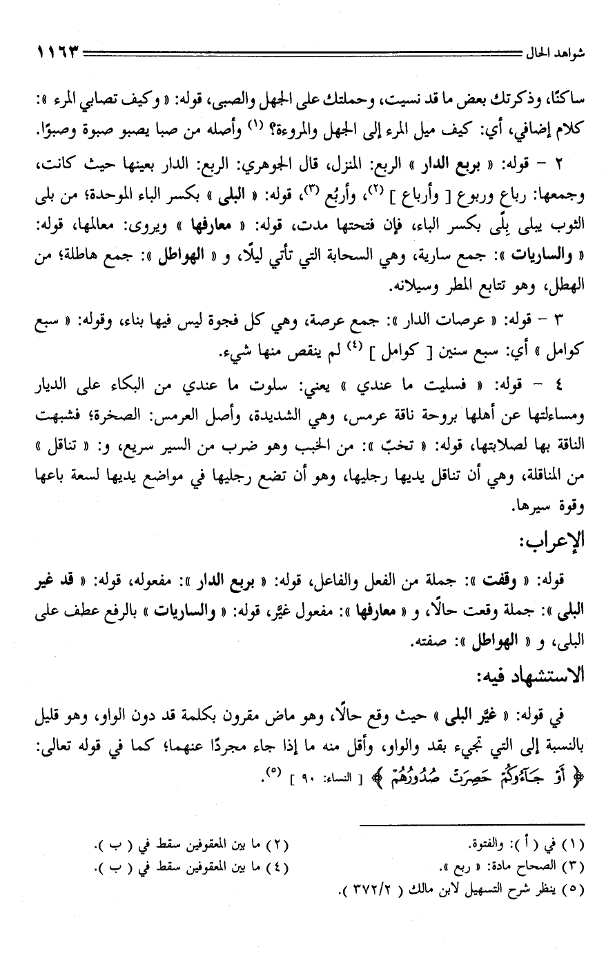 2 - قوله: "بربع الدار" الربع: المنزل، قال الجوهري: الربع: الدار بعينها حيث كانت، وجمعها: رباع وربوع [وأرباع] (¬2)، وأربُع (¬3)، قوله: "البلى" بكسر الباء الموحدة؛ من بلى الثوب يبلى بِلًى بكسر الباء، فإن فتحتها مدت، قوله: "معارفها" ويروى: معالمها، قوله: "والساريات": جمع سارية، وهي السحابة التي تأتي ليلًا، و"الهواطل": جمع هاطلة؛ من الهطل، وهو تتابع المطر وسيلانه.