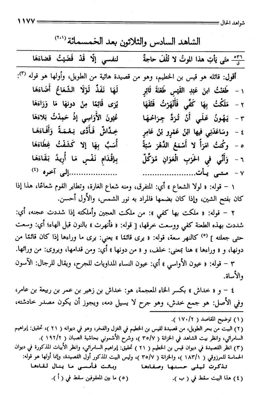 (¬3) انظر القصيدة في ديوان قيس بن الخطيم (21) تحقيق: إبراهيم السامرائي، وانظر الأبيات المذكورة في ديوان الحماسة للمرزوقي (1/ 183)، والخزانة (7/ 35)، وليس البيت المذكور أول القصيدة، وإنما أولها هو قوله: