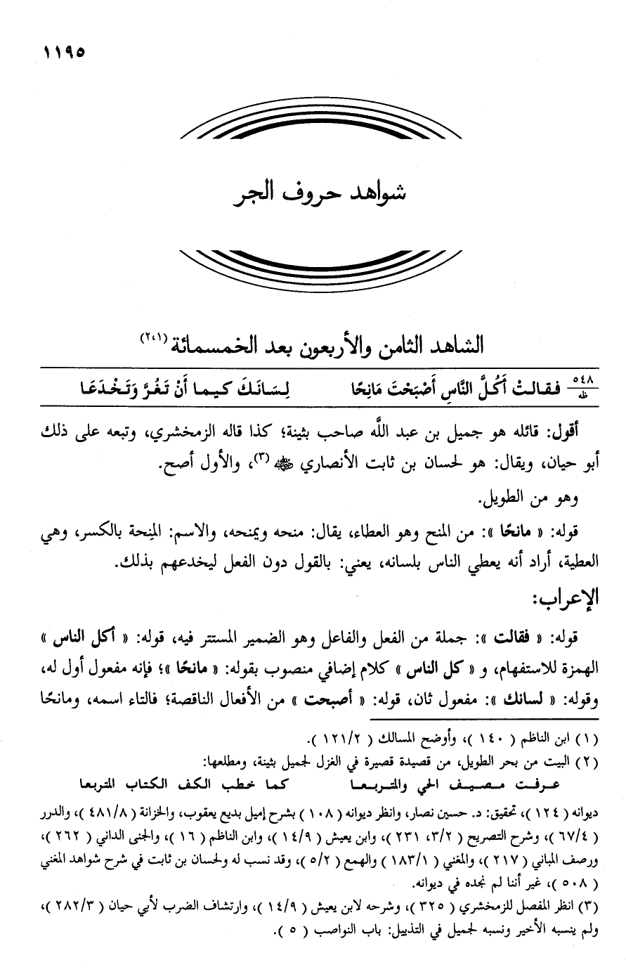 ديوانه (124)، تحقيق: د. حسين نصار، وانظر ديوانه (108) بشرح إميل بديع يعقوب، والخزانة (8/ 481)، والدرر (4/ 67)، وشرح التصريح (2/ 3، 231)، وابن يعيش (9/ 14)، وابن الناظم (16)، والجنى الداني (262)، ورصف المباني (217)، والمغني (1/ 183) والهمع (2/ 5)، وقد نسب له ولحسان بن ثابت في شرح شواهد المغني (508)، غير أننا لم نجده في ديوانه.