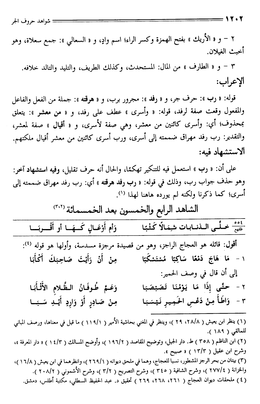 (¬3) بيتان من بحر الرجز المشطور، نسبا للعجاج، وهما في ملحق ديوانه (1/ 269)، وانظرهما في ابن يعيش (8/ 16)، والخزانة (4/ 277)، وشرح الشافية (345)، وشرح التصريح (2/ 3)، وشرح الأشموني (2/ 208).