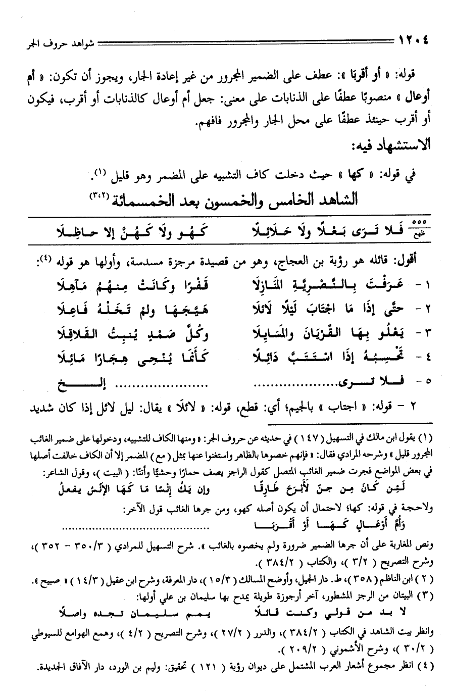 (¬1) يقول ابن مالك في التسهيل (147) في حديثه عن حروف الجر: "ومنها الكاف للتشبيه، ودخولها على ضمير الغائب المجرور قليل" وشرحه المرادي فقال: "فإنهم خصوها بالظاهر واستغنوا عنها بمثل (مع) المضمر إلا أن الكاف خالفت أصلها في بعض المواضع فجرت ضمير الغائب المتصل كقول الراجز يصف حمارًا وحشيًّا وأتنا: (البيت)، وقول الشاعر: