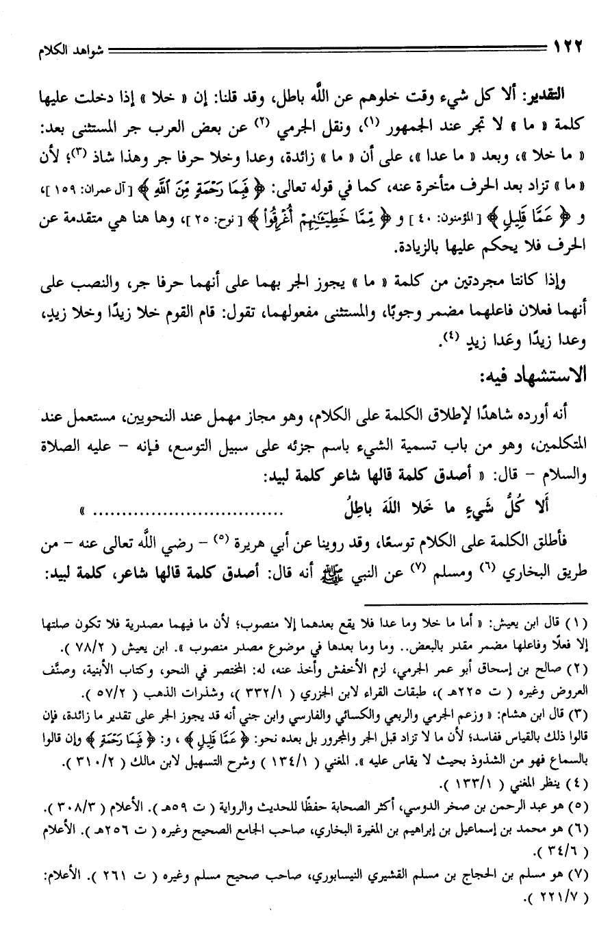 التقدير: ألا كل شيء وقت خلوهم عن الله باطل، وقد قلنا: إن "خلا" إذا دخلت عليها كلمة "ما" لا تجر عند الجمهور (¬1)، ونقل الجرمي (¬2) عن بعض العرب جر المستثنى بعد: "ما خلا"، وبعد "ما عدا"، على أن "ما" زائدة، وعدا وخلا حرفا جر وهذا شاذ (¬3)؛ لأن "ما" تزاد بعد الحرف متأخرة عنه، كما في قوله تعالى: {فَبِمَا رَحْمَةٍ مِنَ اللَّهِ لِنْتَ لَهُمْ} [آل عمران: 159]، و {عَمَّا قَلِيلٍ} [المؤمنون: 40] {مِمَّا خَطِيئَاتِهِمْ أُغْرِقُوا} [نوح: 25]، وها هنا هي متقدمة عن الحرف فلا يحكم عليها بالزيادة.