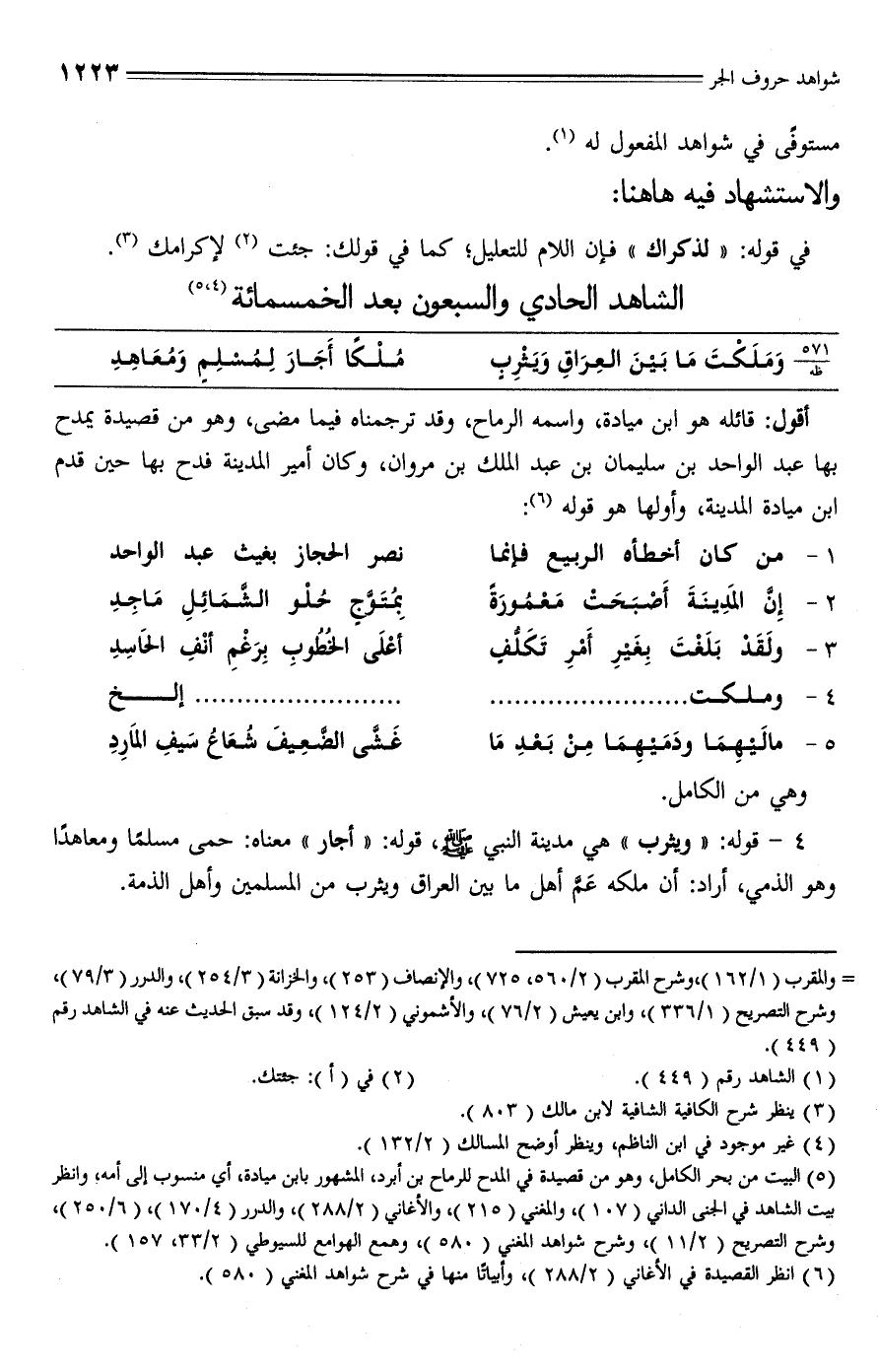(¬5) البيت من بحر الكامل، وهو من قصيدة في المدح للرماح بن أبرد، المشهور بابن ميادة، أي منسوب إلى أمه، وانظر بيت الشاهد في الجنى الداني (107)، والمغني (215)، والأغاني (2/ 288)، والدرر (4/ 170)، (6/ 250)، وشرح التصريح (2/ 11)، وشرح شواهد المغني (580)، وهمع الهوامع للسيوطي (2/ 33، 157).