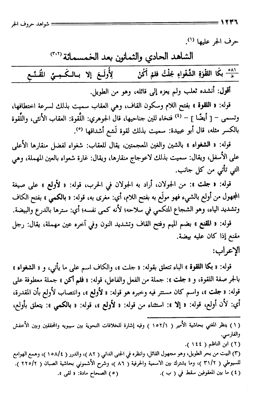 (¬3) البيت من بحر الطويل، وهو مجهول القائل، وانظره في الجنى الداني (82)، والدرر (4/ 158)، وهمع الهوامع للسيوطي (2/ 31)، وما يشترك بين الاسمية والحرفية (86)، وشرح الأشموني بحاشية الصبان (2/ 225).