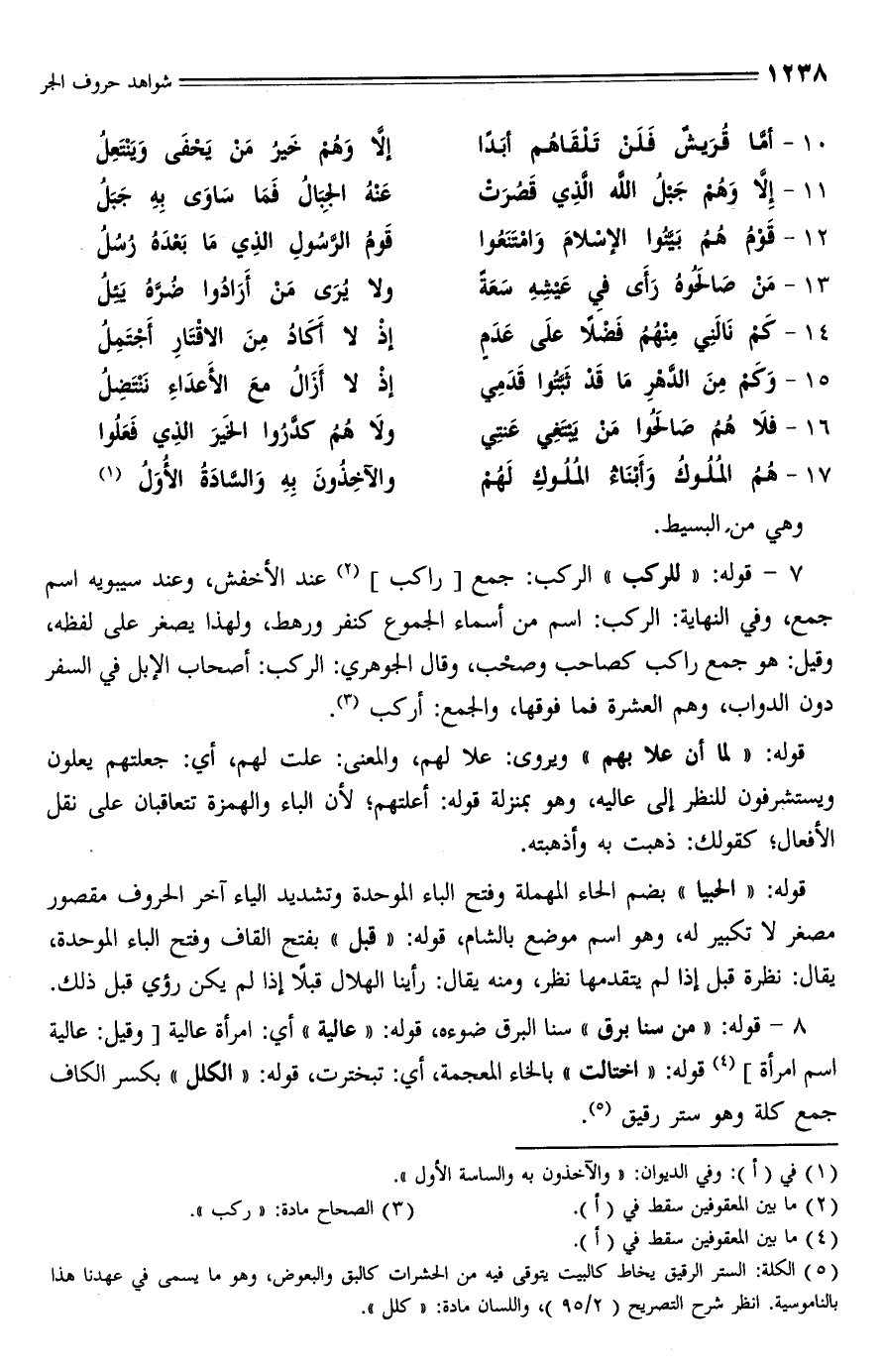8 - قوله: "من سنا برق" سنا البرق ضوءه، قوله: "عالية" أي: امرأة عالية [وقيل: عالية اسم امرأة] (¬4) قوله: "اختالت" بالخاء المعجمة، أي: تبخترت، قوله: "الكلل" بكسر الكاف جمع كلة وهو ستر رقيق (¬5).