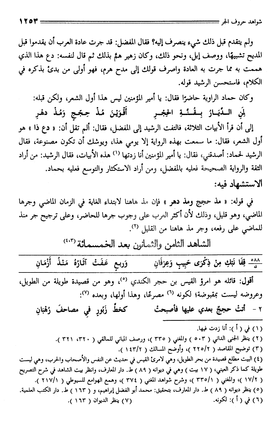 في قوله: "مذ وحجج ومذ دهر" فإن مذ ها هنا لابتداء الغاية في الزمان الماضي وجرها الماضي، وهو قليل, وذلك لأن أكثر العرب وجوب جرها للحاضر, وعلى ترجيح جر منذ للماضي على رفعه، وجر مذ ها هنا من القليل (¬2).