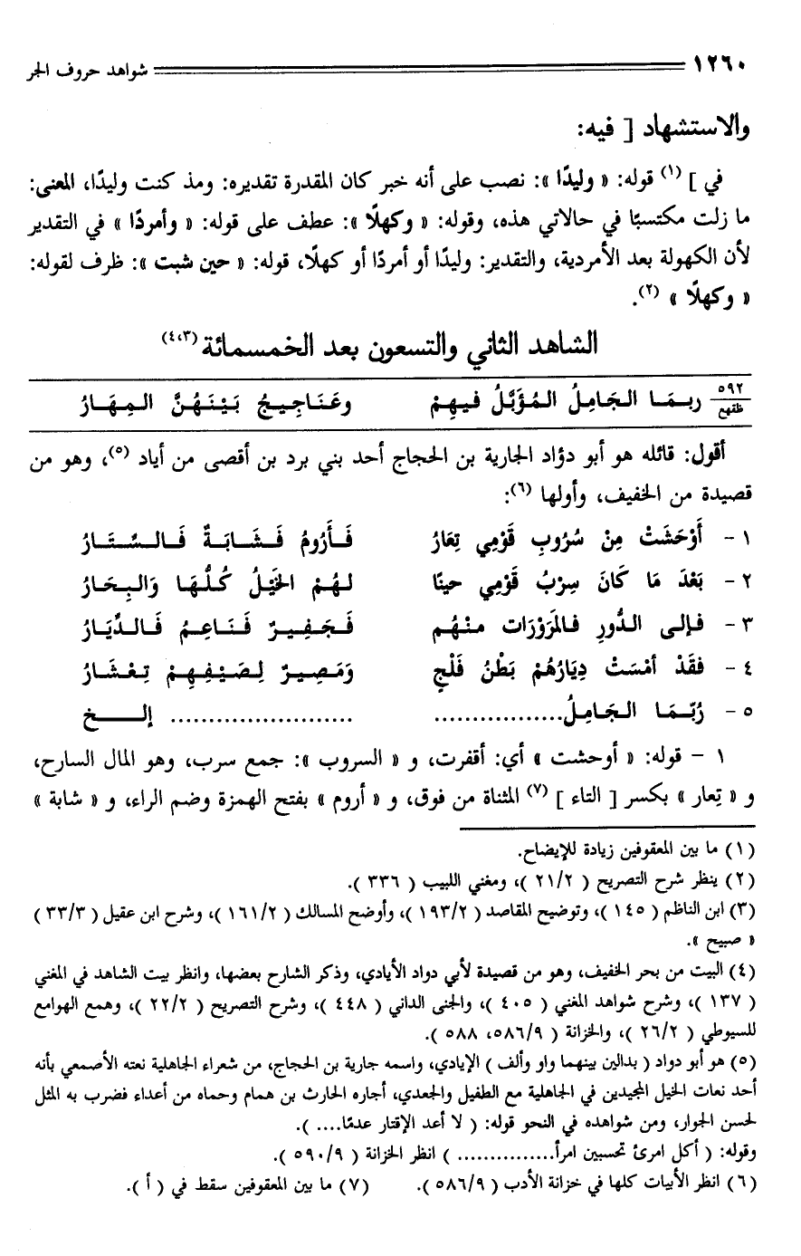 (¬5) هو أبو دواد (بدالين بينهما واو وألف) الإيادي، واسمه جارية بن الحجاج، من شعراء الجاهلية نعته الأصمعي بأنه أحد نعات الخيل المجيدين في الجاهلية مع الطفيل والجعدي، أجاره الحارث بن همام وحماه من أعداء فضرب به المثل لحسن الجوار، ومن شواهده في النحو قوله: (لا أعد الإقتار عدمًا .... ).