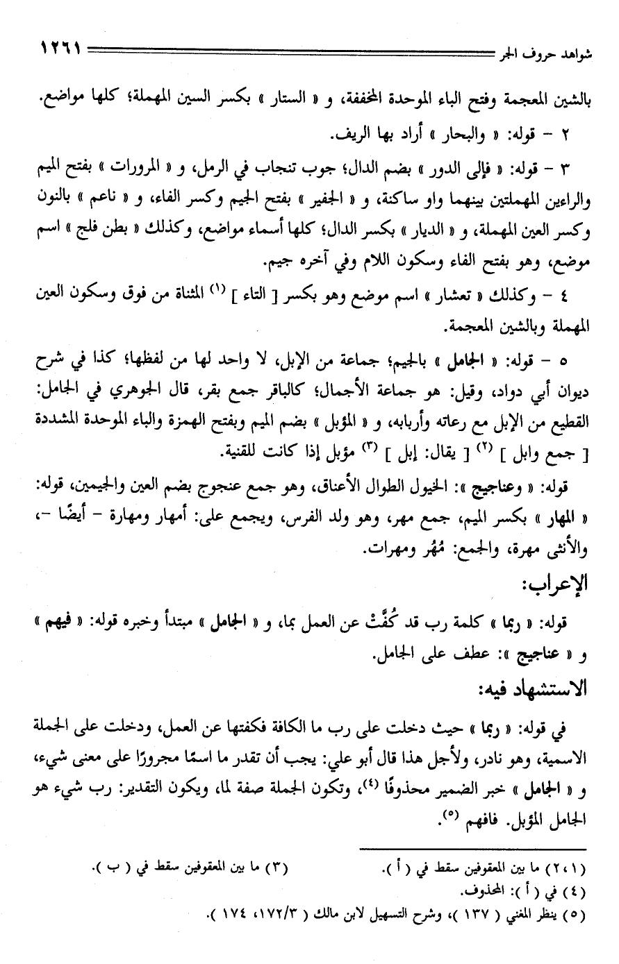 في قوله: "ربما" حيث دخلت على رب ما الكافة فكفتها عن العمل، ودخلت على الجملة الاسمية، وهو نادر، ولأجل هذا قال أبو علي: يجب أن تقدر ما اسمًا مجرورًا على معنى شيء، و"الجامل" خبر الضمير محذوفًا (¬4)، وتكون الجملة صفة لما، ويكون التقدير: رب شيء هو الجامل المؤبل. فافهم (¬5).