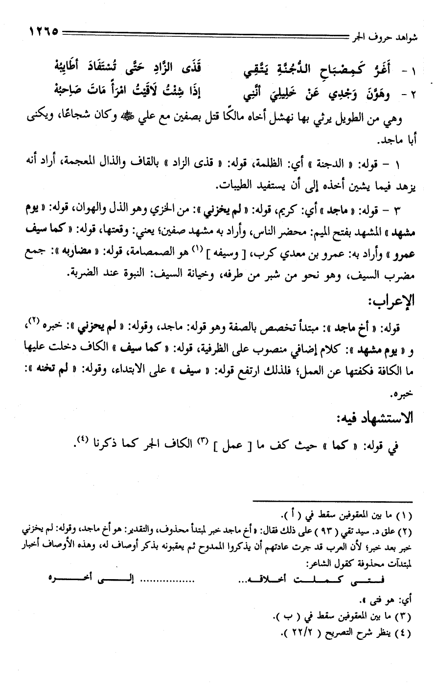 (¬2) علق د. سيد تقي (93) على ذلك فقال: "أخ ماجد خبر لمبتدأ محذوف، والتقدير: هو أخ ماجد، وقوله: لم يخزني خبر بعد خبر؛ لأن العرب قد جرت عادتهم أن يذكروا الممدوح ثم يعقبونه بذكر أوصاف له، وهذه الأوصاف أخبار لمبتدآت محذوفة كقول الشاعر: