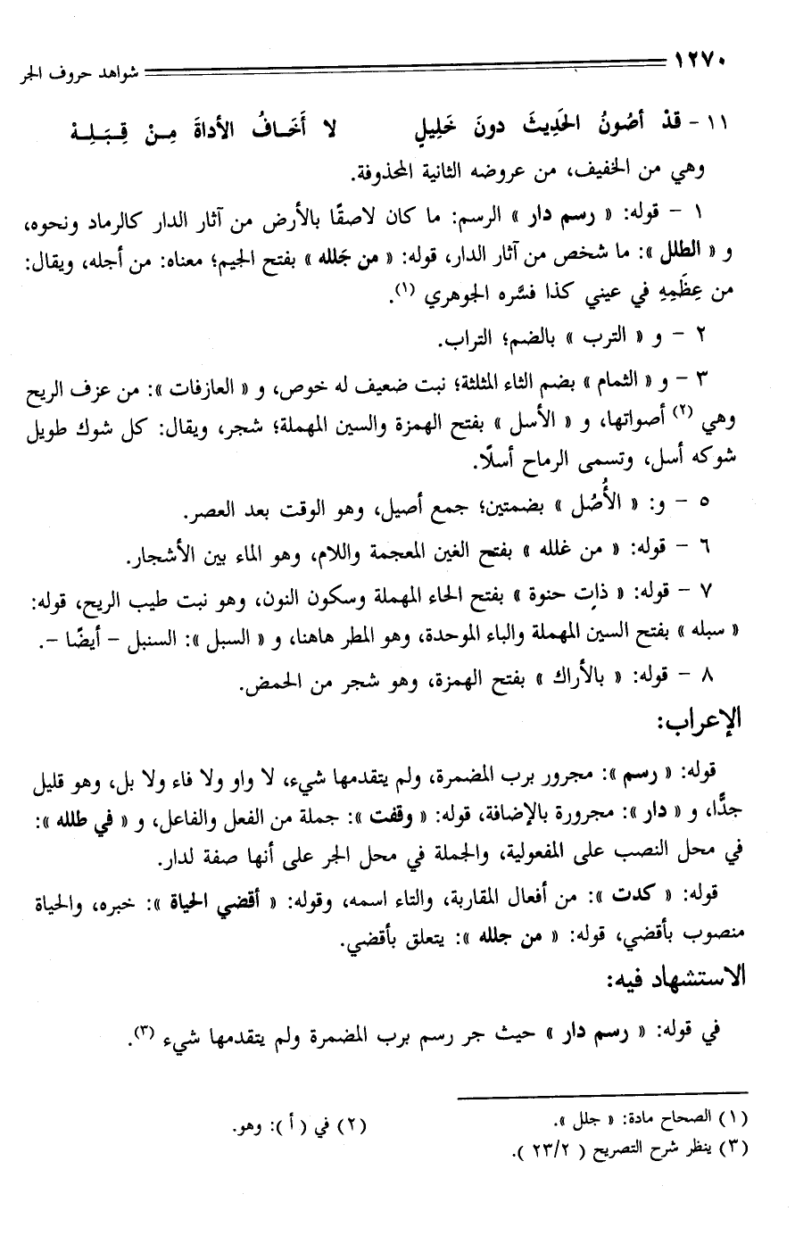 1 - قوله: "رسم دار" الرسم: ما كان لاصقا بالأرض من آثار الدار كالرماد ونحوه، و"الطلل": ما شخص من آثار الدار، قوله: "من جَلله" بفتح الجيم؛ معناه: من أجله، ويقال: من عِظَمِهِ في عيني كذا فسَّره الجوهري (¬1).